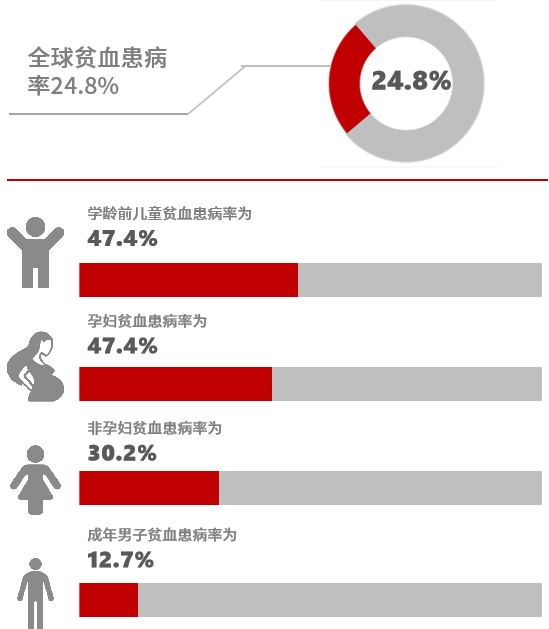 从贫血的流行病学角度而言,显示近年贫血患者全球约有16.2亿人,相当于全球人口的24.8%。